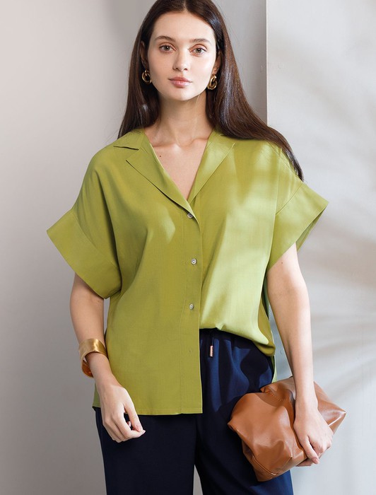 Состав: 55%Вис 45%Лиоцелл (Вис) Плотность: 115 Г/м2Блузка светло-оливкового цвета сочетает в себе комфорт и элегантность благодаря материалу из вискозы с лиоцеллом. Аккуратный отложной воротник подчеркивает утонченность образа, а широкие короткие рукава привлекают внимание и делают силуэт современным. Спущенная линия плеча формирует расслабленный, но стильный внешний вид, что идеально для тех, кто ценит индивидуальность и уверенность в деталях. Крой продуман так, чтобы подчеркивать достоинства фигуры и на больших размерах, создавая гармоничный силуэт без лишних усилий. Ткань из вискозы с добавлением лиоцелла обеспечивает приятные ощущения и отличную посадку, струится на теле и охлаждает в жаркую погоду. При пошиве использована технология «чистый край» по всей длине центральной планки и низу изделия. Это признак премиум качества — «чистый край» вместо оверлока. Блузку можно носить с топом, не застегивая — при этом распахнутая блузка будет выглядеть максимально эстетично. Рубашка легко впишется как в деловой гардероб, так и в повседневный стиль, позволяя выглядеть безупречно независимо от ситуации.