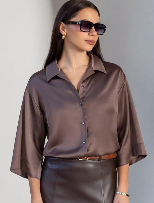Состав: 97%ПЭ 3%ПУ Плотность: 190 Г/м2Элегантная блузка кофейного цвета на пуговицах выполнена из плотного струящегося сатина, который мягко ложится по фигуре и создает эффектную посадку. Отложной воротник придает образу женственную и изящную нотку. Материал отличается дышащей структурой, благодаря чему комфорт сохраняется даже в течение всего дня. Широкие рукава обеспечивают свободу движений и подходят для полных рук, делая блузку универсальной для разных типов фигур, в том числе для больших размеров. Красивая гладкая фактура материала подчеркивает утонченность изделия, добавляя легкое сияние к любому образу. Благодаря продуманному крою эта рубашка смотрится стильно как в повседневной жизни, так и на особых мероприятиях. Ткань практична, она приятна на ощупь, легко ухаживается и долго сохраняет первоначальный вид даже после многократных стирок и активной носки.