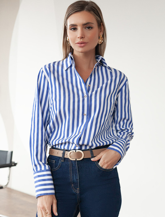 Состав: 65%Хлопок 35%ПЭ Параметры модели на первом фото: Рост 170, бюст 89, талия 63, бедра 92Блузка свободного силуэта выполнена из смесовой струящейся ткани. Модель в вертикальную полоску дополнена золотистыми рельефными пуговицами. Свободный силуэт подходит для любой фигуры. Для идеального роскошного образа используйте в качестве низа брюки светлых тонов. На спинке изделия фирменный металлический логотип бренда.