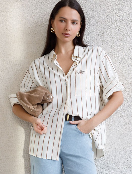 Состав: 75%Хлопок 25%ПЭ Плотность: 108 Г/м2Блузка светло-бежевого цвета в кофейную полоску свободного силуэта отлично подходит для повседневной носки и создания стильных образов. Благодаря хлопку с добавлением эластана ткань хорошо дышит, освежает и подходит для работы даже в жаркое время года. Натуральный материал плотностью 108 Г/м2 не просвечивает и выглядит аккуратно даже после многочисленных стирок. Рубашка отличается удлиненной спинкой, что удобно для разных вариантов сочетания одежды. Карман на груди добавляет функциональности и практичности. Деликатная вышивка на кармане в виде логотипа бренда выглядит изысканно. Принт в полоску визуально вытягивает силуэт, подчеркивая индивидуальность и добавляя стильный акцент. Классический крой блузки и базовая цветовая гамма позволяют вписать эту вещь в любой гардероб, независимо от выбранного стиля — будь то офисная атмосфера или расслабленный выход на прогулку. Отложной воротник аккуратно подчеркивает фигуру и придает образу завершенность. Застежка на пуговицы обеспечивает комфортную регулировку и удобство в использовании. Универсальный фасон рубашки хорошо смотрится на любые размеры, в том числе и большие, скрывает недостатки и выгодно подчеркивает достоинства фигуры.