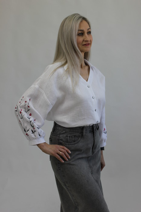 Блузон свободного кроя с асимметричной вышивкой на рукавах. Вырез V-образный с отложным воротником. Рукав свободный