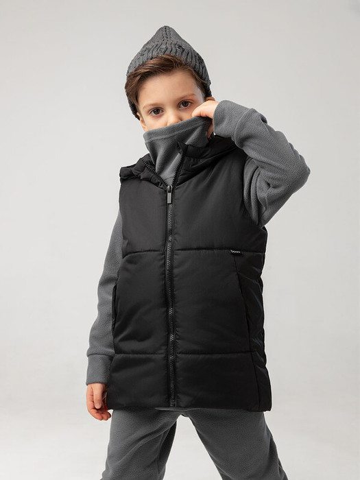 Стильный жилет на молнии, по бокам прорезные карманы, несъемный капюшон.Материал жилета Дюспо воздухообменный и ветрозащитный. Материал верха: Дюспо 100% полиэстер, утеплитель Hetta Filt S2 150 г/кв.м, подкладочный материал кулирная гладь 100% хлопок