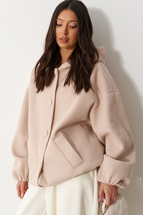 Жакет (бомбер), прямого силуэта , на подкладке. Выполнен из фактурной пальтовой ткани бежевого цвета. Характеристика: горловина круглая с притачным капюшеном. Линия плеча спущенная. Рукав длинный, одношовный, втачной. По низу присборен на резинку. По деталям полочки прорезные карманы с накладными листочками. Спинка цельная. Застежка центральная бортовая, застегивающаяся на прорезные петли и пришивные пуговицы. Длина рукава от горловины 78см, длина по спинке 71 см.