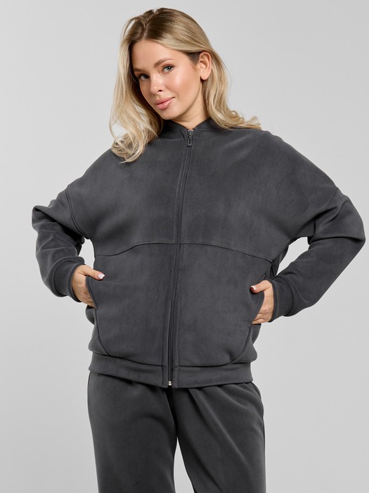 Куртка-бомбер – молодежная из гладкокрашенного трикотажного полотна «дабл-флис» (двухсторонний флис) прямого силуэта, свободная, с длинными втачными рукавами, горловиной овальной формы, обработанной втачной планкой, центральной бортовой застежкой на тесьму «молния». Полочка и спинка состоят из двух деталей, низ изделия с притачным поясом, рукава с притачными манжетами. Пояс, планка горловины, манжеты рукавов выполнены из основного материала.