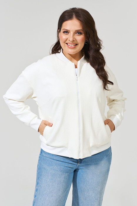 Стильная куртка-бомбер на подкладке из натуральной фактурной ткани в полоску и  прорезными карманами по переду; рукава втачные со спущенной линией плеча; застежка на молнию; низ, горловина, рукава бомбера дополнены трикотажной резинкой. Бомбер соответсвует заявленному размеру.