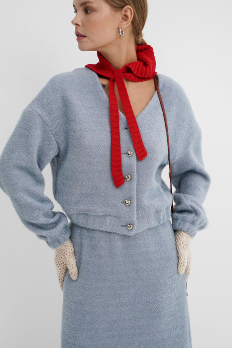 Пушистый укороченный бомбер с декоративными пуговицами.