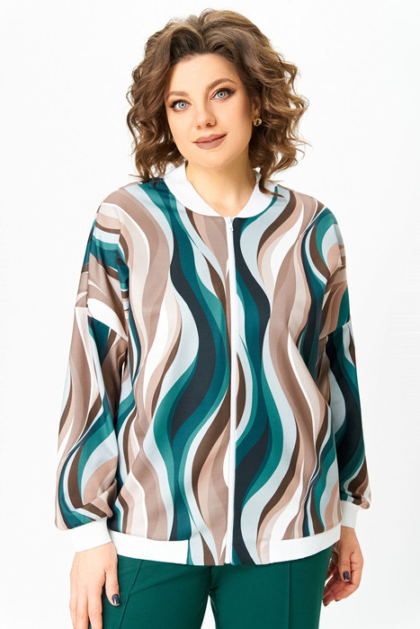 Бомбер женский из вискозного трикотажного полотна свободного кроя со спущенной линией плеча и с центральной застёжкой на молнию. В боковых швах обработаны карманы. Горловина округлая со стойкой из трикотажного довяза. Рукав длинный. По низу рукава и изделия - довяз.
