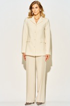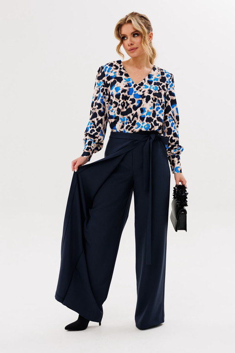 Брюки прямого силуэта с имитацией запаха на притачном поясе. По переду застежка на тесьму-молнию. По боковым действующие карманы.