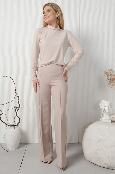 Облегающие широкие брюки с высокой талией. Изделие имеет защипы-канты по передней и задней половинке. Застежка на потайную молнию в боковом шве.