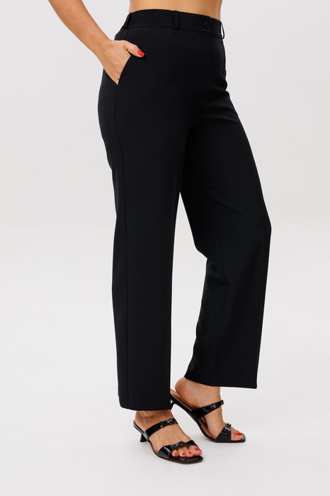 Эти классические брюки созданы для тех, кто ценит безупречный крой и комфорт. Высокая посадка деликатно поддерживает фигуру, а прямой крой со стрелками визуально вытягивает силуэт, делая его стройнее. Модель брюк универсальная, подойдёт также и обладательницам пышных бедер.