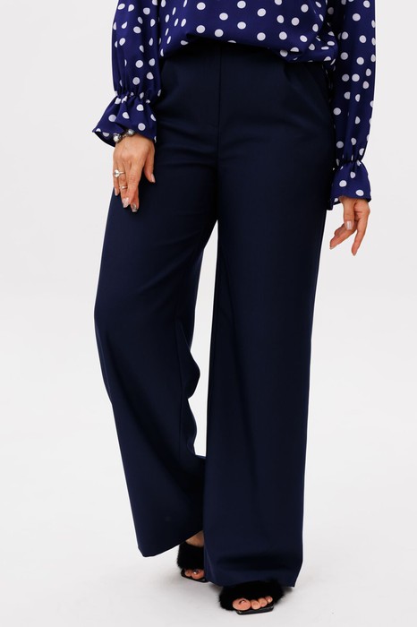 Идеальная посадка достигнута за счет эластичной резинки по спинке, которая мягко облегает фигуру, подчеркивая линию талии и обеспечивая комфорт в течение всего дня. Широкие штанины визуально удлиняют ноги, добавляя образу женственности и грации.