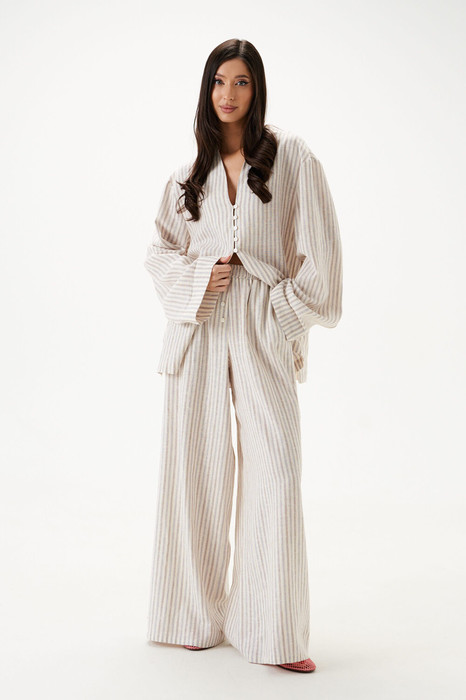 Брюки свободного кроя. Выполнены из льняного (смесового) полотна. Пояс на резинке. По переду имитация застёжки с пуговичками. Наклонные карманы. Длина 110 см