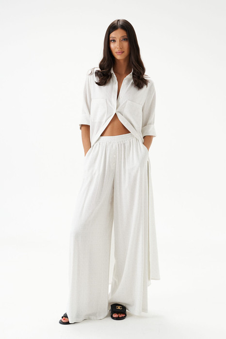 Брюки свободного кроя. Выполнены из текстильного полотна белого цвета в мелкий горошек. В боковых швах карманы с отрезным бочком. Пояс на резинке. На Поясе имеются декоративные строчки. По переду имеется имитация застёжки на 3 пуговицы. Длина 105 см