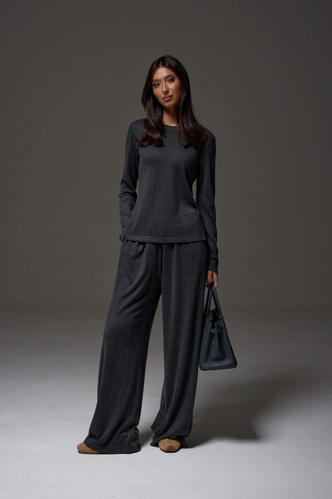 Брюки прямого, свободного кроя выполнены из трикотажного полотна графитового цвета. Характеристики: прямой крой, пояс на резинке, в боковых швах карманы. Длина брюк 107 см.