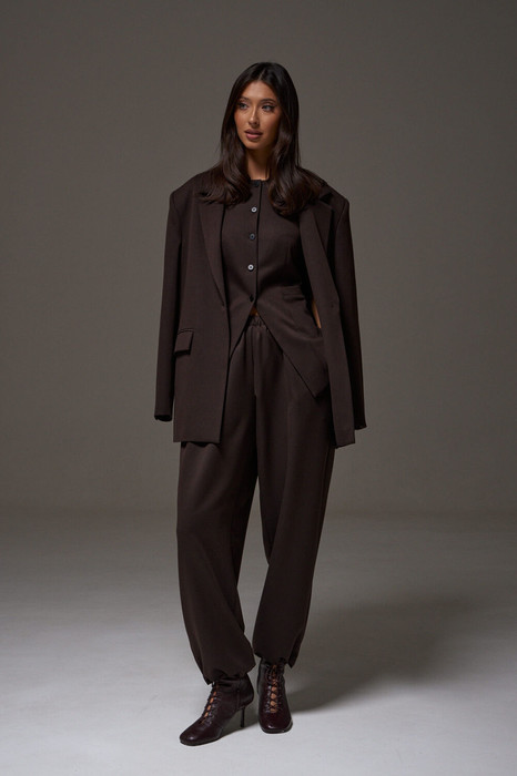 Брюки свободного кроя. Выполнены из плотной текстильной ткани шоколадного цвета. Пояс на резинке. Застёжки нет. В боковых швах карманы. Низ брючины на резинке с фиксатором (регулируется). Длина брюк 100 см