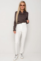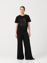Брюки прямого кроя выполнены из ткани черного цвета.Характеристики: прямой крой, эластичная брендированная резинка, боковые карманы, на передней и задней частях брюк застрочены складки и заутюжены стрелки. Длина брюк 112 см