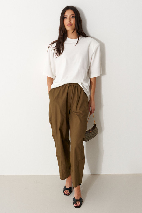 Брюки свободного кроя, зауженные к низу, выполнены из хлопкового полотна коричневого цвета. Характеристика: свободный крой, брючины широкие, заужаются к низу, пояс на резинке, имитация гульфика, в боковых швах карманы с отрезным бочком. Передние и задние детали разделены на две части. Боковые части с вытачками. По переду и спинке отстрочены канты. По задним половинам накладные фигурные карманы. Длина по боковому шву 95 см