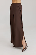Брюки из вискозной ткани с сатиновым эффектом, зауженные к низу, с застежкой на молнию спереди и резинкой в поясе. В брюках четыре функциональных кармана и два отделочных в нижней боковой части изделия.