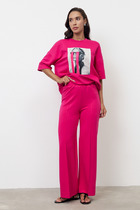Брюки женские из гладкокрашенного трикотажного полотна «лининг» прямого кроя, длинные, свободные, расширенные к низу, на поясе с эластичной тесьмой внутри, карманами в боковых швах. Передние половины застрочены двумя параллельными линиями, смещенными к боковым швам.