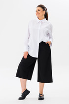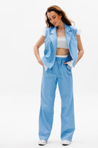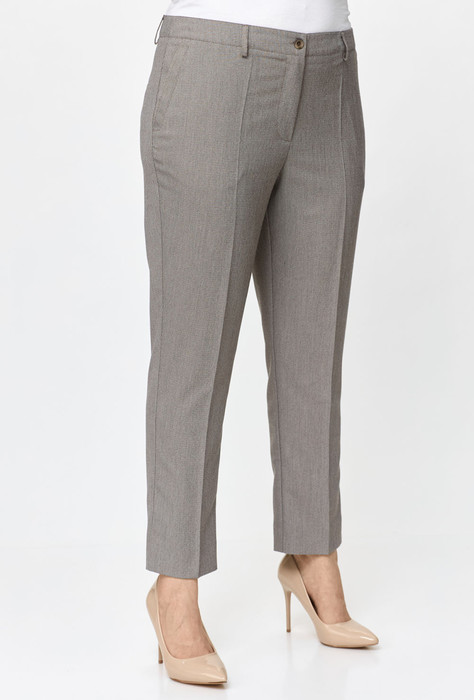 Брюки классические, из плотной текстильной ткани, прямые, слегка заужены к низу, заутюжены стрелки, по переду обработаны карманы с отрезным бочком, застежка на тесьму-молнию и 1 пуговицу. На задних половинках обработаны вытачки и имитация карманов в рамку с двумя обтачками, пояс в брюках притачной, без резинки.По низу брюк в боковом шве есть небольшой разрез. Длина брюк от талии по боковому шву 96 см.