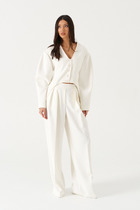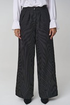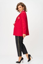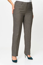 Брюки прямые, классические, с заутюженными стрелками, по переду обработаны карманы с отрезным бочком, застежка на тесьму-молнию и 1 пуговицу. На задних половинках обработаны вытачки и имитация карманов с листочкой, пояс в брюках притачной, по боковым швам резинка. Длина брюк от талии по боковому шву 103 см.