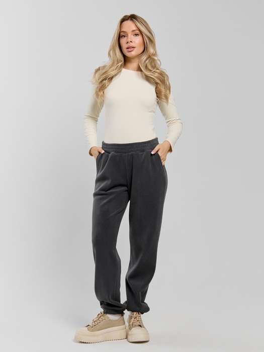 Брюки молодежные из гладкокрашенного трикотажного полотна« дабл-флис» (двухсторонний флис), длинные, с карманами в боковыхшвах, на поясе с эластичной тесьмой внутри. Подгибка нижних срезов выполнена с эластичной тесьмой.
