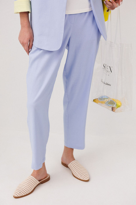 Брюки зауженные к низу на притачном отстроченном поясе. По переду имитация гульфика и карманом-листочкой от бокового шва.