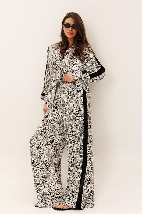 Брюки широкие с притачным поясом на резинке и карманами по боковым швам. Ломпас выполнен из шифона.