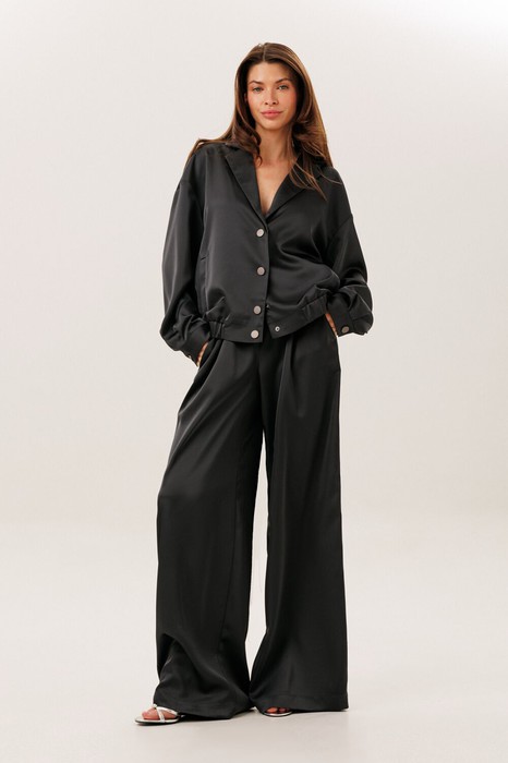 Брюки широкие с притачным поясом на резинке и карманами по боковым швам.