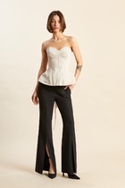 Брюки выполнены из джинса. Брюки покроя "клеш", на притачном поясе, длиной "в пол". Застежка спереди на молнию с гульфиком и пуговицу. Спереди боковые карманы с фигурным входом. Сзади кокетки и декоративные клапаны. В области шагового шва клин, расширяющийся к низу. Брюки декорированы нашивками спереди и сзади по поясу.