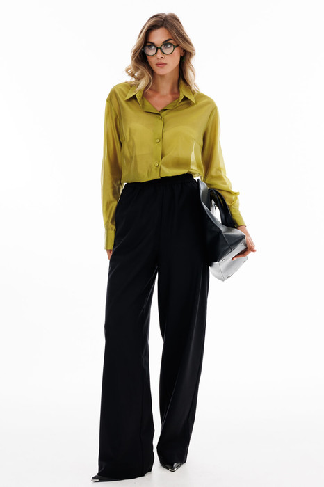Брюки выполнены из костюмной ткани. Брюки прямого покроя длиной в пол, на притачном поясе с эластичной тесьмой. Спереди боковые карманы с наклонным входом.
