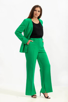 Брюки выполнены из костюмной ткани. Брюки зауженны к низу, длиной 7/8, на притачном поясе. Спереди боковые карманы с наклонным входом и застежка на пуговицу и молнию. Сзади талиевые вытачки и декоративные прорезные карманы. По задней части пояса эластичная тесьма.