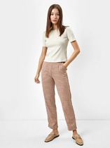 Брюки женские из трикотажного полотна «кулирка» с набивным рисунком, прямого кроя слегка зауженные книзу, с карманами в боковых швах, на притачном поясе с эластичной тесьмой внутри.