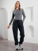 Брюки молодежные из трикотажного гладкокрашенного полотна «флис», длинные, на притачном поясе с эластичной тесьмой внутри и шнурком, продетым через две петли в центре пояса, с карманами в боковых швах и эластичной тесьмой по низу.