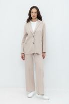 Брюки палаццо с притачным поясом из мягкой вельветовой ткани. Спереди застежка гульфик на молнии и петлей и пуговицей по поясу. По задней частям брюк вытачки. Пояс с резинкой в боковых частях. Брюки с заутюженными стрелками. Длина брюк с учетом пояса - 109 см.