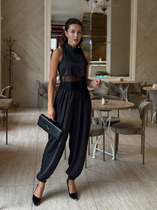 Брюки палаццо с притачным поясом из мягкой вельветовой ткани. Спереди застежка гульфик на молнии и петлей и пуговицей по поясу. По задней частям брюк вытачки. Пояс с резинкой в боковых частях. Брюки с заутюженными стрелками. Длина брюк с учетом пояса - 109 см.