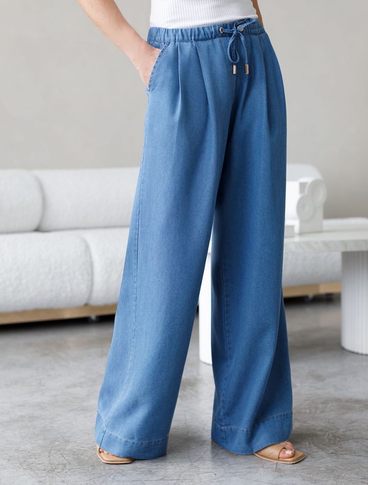 Состав: 60%Лиоцелл (Вис) 36%ПЭ 4%ВисБрюки свободного кроя выполнены из лиоцелла. Модель с эластичным поясом на резинке дополнена регулируемым шнуром из основного полотна, боковыми карманами и одним карманом сзади. Ткань с характерным атласным блеском полностью имитирует обычный деним, но в тоже время намного более мягкая, плавно струится по телу, хорошо драпируется и охлаждает кожу в жаркое время года. Изделие сочетается в костюме с блузкой D59.017