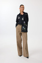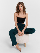 Брюки женские, выполнены из костюмной ткани, пояс притачной частично на резинке. Застежка на тесьму-молнию и петлю-пуговицу. В брюках обработаны карманы.