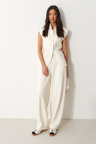 "Брюки женские, свободного силуэта, выполнены из хлопкового вельвета. Пояс притачной, частично на резинке. Застежка на молнию, петлю и пуговицу. В передних деталях брюк обработаны боковые карманы с подрезным бочком.