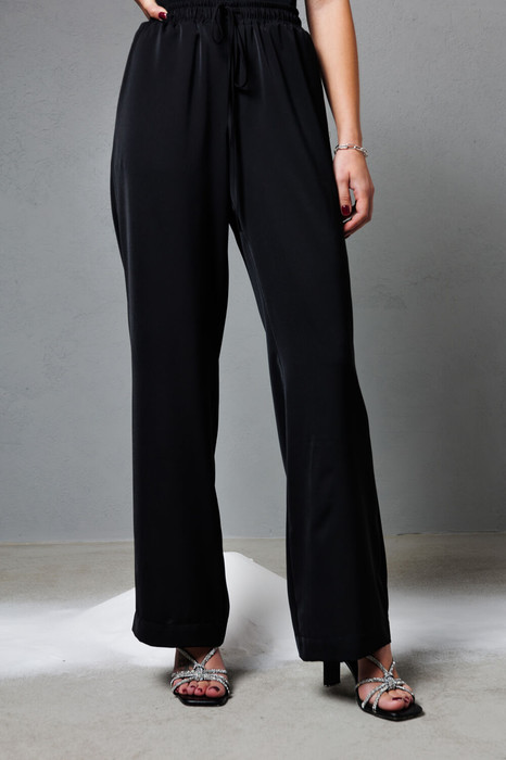 Атласные брюки прямого кроя. Пояс в брюках на резинке, по переду расположены карманы. Длина брюк - 107 см.