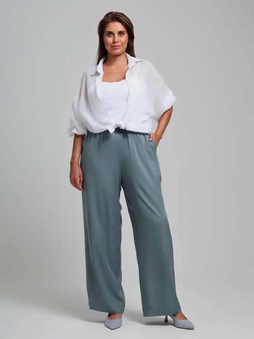 Брюки женские из гладкокрашеного тканого штапельного полотна, свободного покроя, удлиненные, с карманами в бокавых швах, на притачном поясе с эластичной тесьмой внутри.
