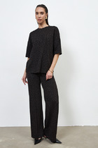 Брюки – женские из трикотажного полотна «кулирка» с набивным рисунком, полуприлегающего силуэта, длинные, с карманами в боковых швах, на притачном поясе с эластичной тесьмой внутри. Нижние срезы обработаны манжетами.