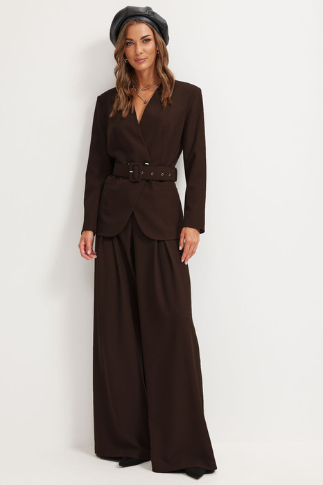 Брюки прямого силуэта из костюмной ткани. По верху брюк притачной пояс с застежкой на петлю и пуговицу и шлевками для ремня. На передних половинках обработаны карманы и застежка молния в среднем шве. Передние половинки брюк со встречной складкой, в которой расположена декоративная молния. На задних половинках вытачки. По поясу задних половинок брюк резинка (от вытачки до вытачки). Обращаем ваше внимание, что фурнитура может отличаться от фото.
