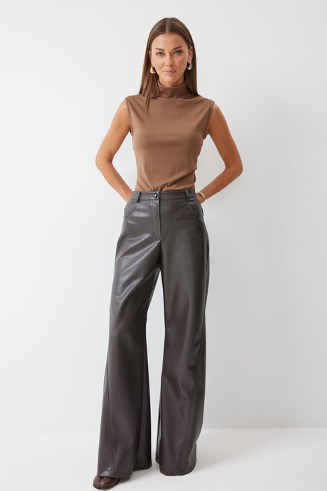 Брюки прямого силуэта расширенные книзу из экокожи. По верху притачной пояс с застежкой на петлю и пуговицу и шлевками для ремня. На передних половинках обработаны карманы и застежка молния в среднем шве. На задних половинках кокетка и накладные карманы. На кармане дизайнерская вышивка. По поясу задних половинок брюк резинка. Обращаем ваше внимание, что фурнитура может отличаться от фото.