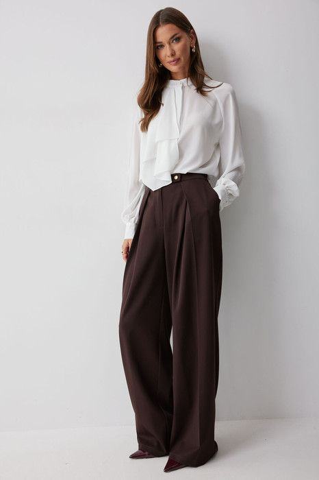 Брюки прямого силуэта расширенные книзу из костюмной ткани. По верху брюк  притачной пояс с застежкой на петли и пуговицы. На передних половинках обработана застежка молния в среднем шве. На передних половинках карманы и декоративные складки. По поясу задних половинок брюк резинка и вытачки. Обращаем ваше внимание, что фурнитура может отличаться от фото.