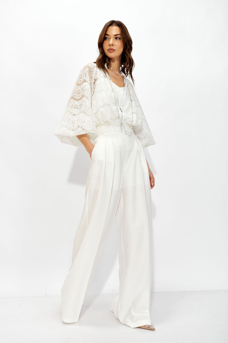 Брюки прямого силуэта из струящейся ткани. По верху брюк притачная декоративная резинка. По переду обработаны карманы в боковых швах и декоративные складки. На задних половинках брюк листочки. Брюки на подкладке! Обращаем ваше внимание, что фурнитура может отличаться от фото.