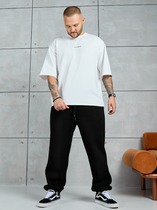 Брюки мужские прямого силуэта, из трикотажного полотна «футер двунитка с лайкрой». Модель с рельефными швами по передним деталям, декоративной «нашивкой», с карманами в боковых швах, на притачном поясе с отстроченной эластичной тесьмой и шнуром для регулирования степени прилегания изделия по линии талии, продетым через две обметанные петли в центре пояса.