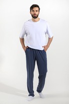 Брюки мужские из пластичного однотонного трикотажного полотна в рубчик, приятного к телу. Модель свободная, прямого силуэта, с боковыми карманами с обтачными входами, на притачном поясе с отстроченной эластичной тесьмой.