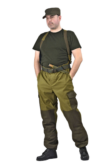 Брюки - Свободного покроя - Съемные подтяжки - Пояс на эластичной тесьме "резинка" и шлевками под ремень - Гульфик с застёжкой на петли и пуговицы - 2 верхних кармана в боковых швах - В области коленей и на задних половинках брюк в области сидения – усиливающие накладки - 2 боковых накладных кармана с клапаном на петлю и пуговицу - 2 задних накладных кармана на петлю и пуговицу - Задние половинки под коленом собраны под резинку - Пылезащитная юбка (пуфта) из бязи на завязках по низу брюк - Низ брюк на резинке