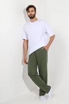Брюки мужские из гладкокрашенго трикотажного полотна "футер 2 -нитка", свободного покроя, на притачном поясе с эластичной тесьмой внутри, с карманами в боковых швах. Нижние срезы обработаны подгибкой.
